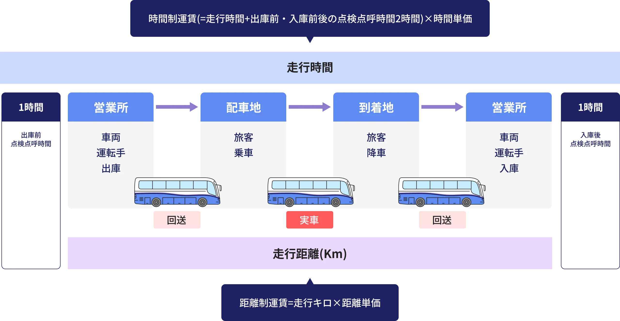 利用するバスが車庫を出庫してから入庫するまでの走行時間と、出庫前および入庫後の点検点呼時間の各1時間(合計2時間)を走行時間に加算し、1時間あたりの時間単価を掛けたものが走行運賃となります。