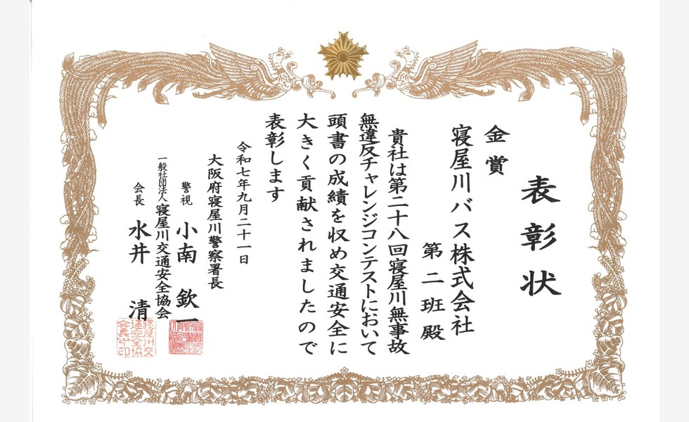 当社は「第二十八回 寝屋川無事故無違反チャレンジコンテスト」に参加し、昨年に続き金賞を受賞いたしました。